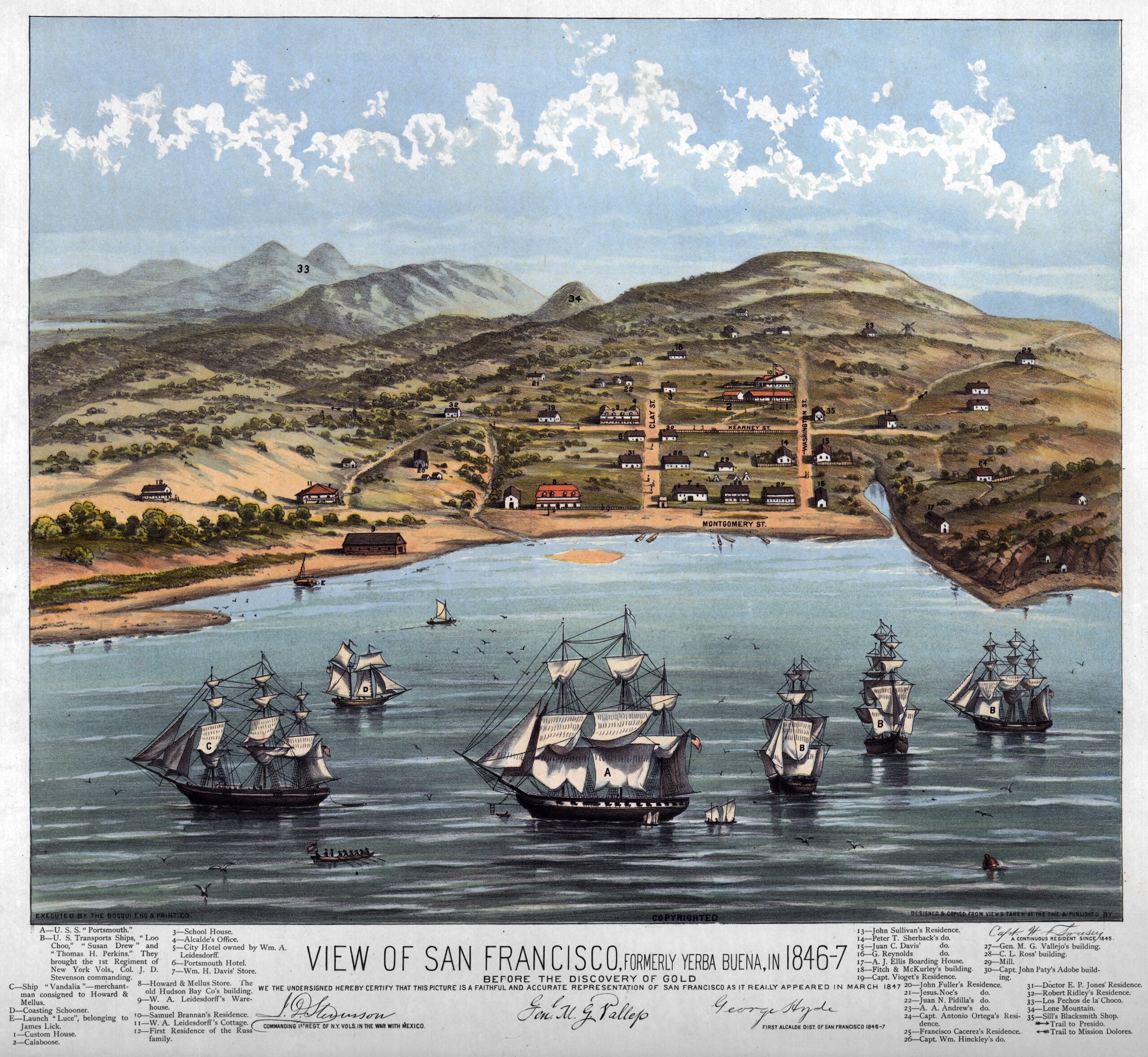 1846년, 미국이 캘리포니아를 점령하던 무렵의 예르바 부에나 코브(현재의 샌프란시스코 만 안쪽 작은 항구)를 그린 그림으로, 1884년에 에드워드 보스키 회사가 제작했습니다. 이 그림은 당시 그곳에 머물렀던 윌리엄 F. 소시 선장의 증언을 바탕으로 재구성된 것입니다.